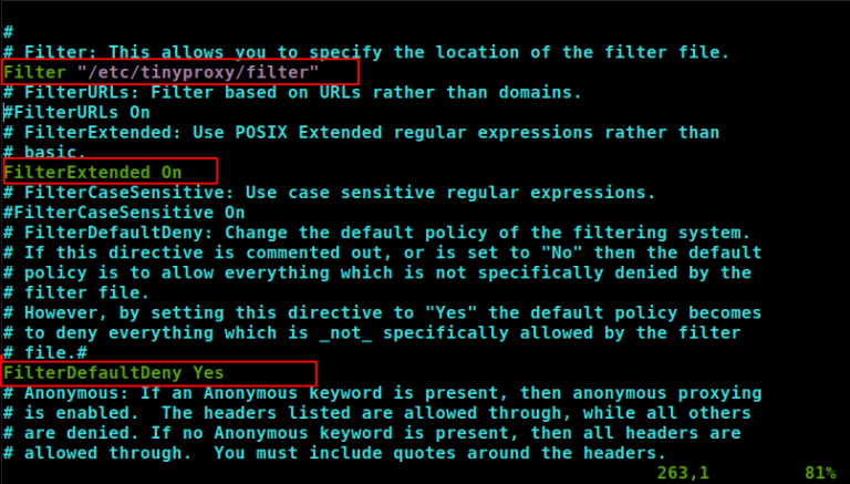Перейдите в строку Фильтр «/etc/tinyproxy/filter». Закомментируйте эту строку. Вы можете установить фильтр по URL или доменам. Также ниже этой строки закомментируйте другую строку: «FilterExtanded On» . И «FilterDefaultDeny Yes».