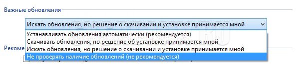 - Открываем настройки Центра обновлений Windows. Выбираем пункт «Не проверять наличие обновлений», нажимаем ОК.