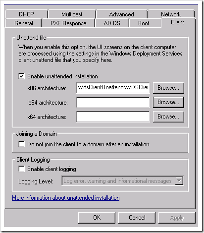 WDSUnattend.xml (Позволяет автоматизировать работу windowsPE, включая соединение с сервером WDS, создание дисковых разделов, выбор раздела для установки Windows 7, и выбор языка установки. Файл WDSUnattend.xml задается на вкладке Client в свойствах вашего сервера WDS).