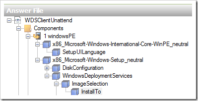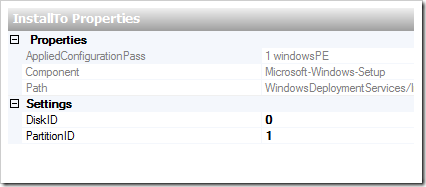 И последний компонент, который мне бы хотелось добавить: Microsoft-Windows-SetupWindowsDeploymentServicesImageSelectionInstallTo, определяющий на какой раздел будет производится установка образа Windows 7.