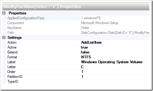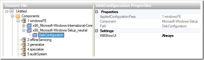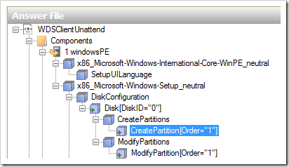 | 1 WindowsPE | Microsoft-Windows-SetupDiskConfigurationDiskCreatePartitionsCreatePartition | Order = 1