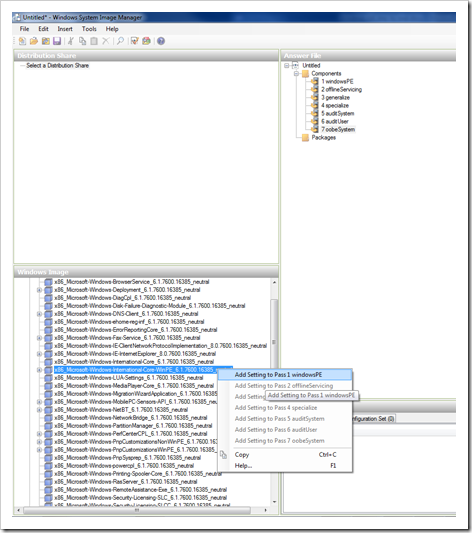 После того, как мы создали новый файл ответов WDSUnattend.xml, мы должны включить в него различные параметры (компоненты). Это можно сделать, развернув узел «components» в окне Windows Image и щелкнув правой клавишей по нужному компоненту и добавив данный параметр в файл ответов. На первый взгляд вся процедура выглядит достаточно сложно и громоздко, так как число различных компонентов и параметров, которые мы можем добавить в наш файл ответов очень велико.